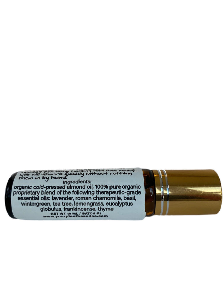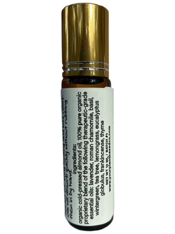 Ingredients: Organic Cold-Pressed Almond Oil,100% pure therapeutic-grade blend of the following essential oils: Lavender, Roman Chamomile, Basil, Wintergreen, Tea Tree, Lemongrass, Eucalyptus, Frankincense, and Thyme