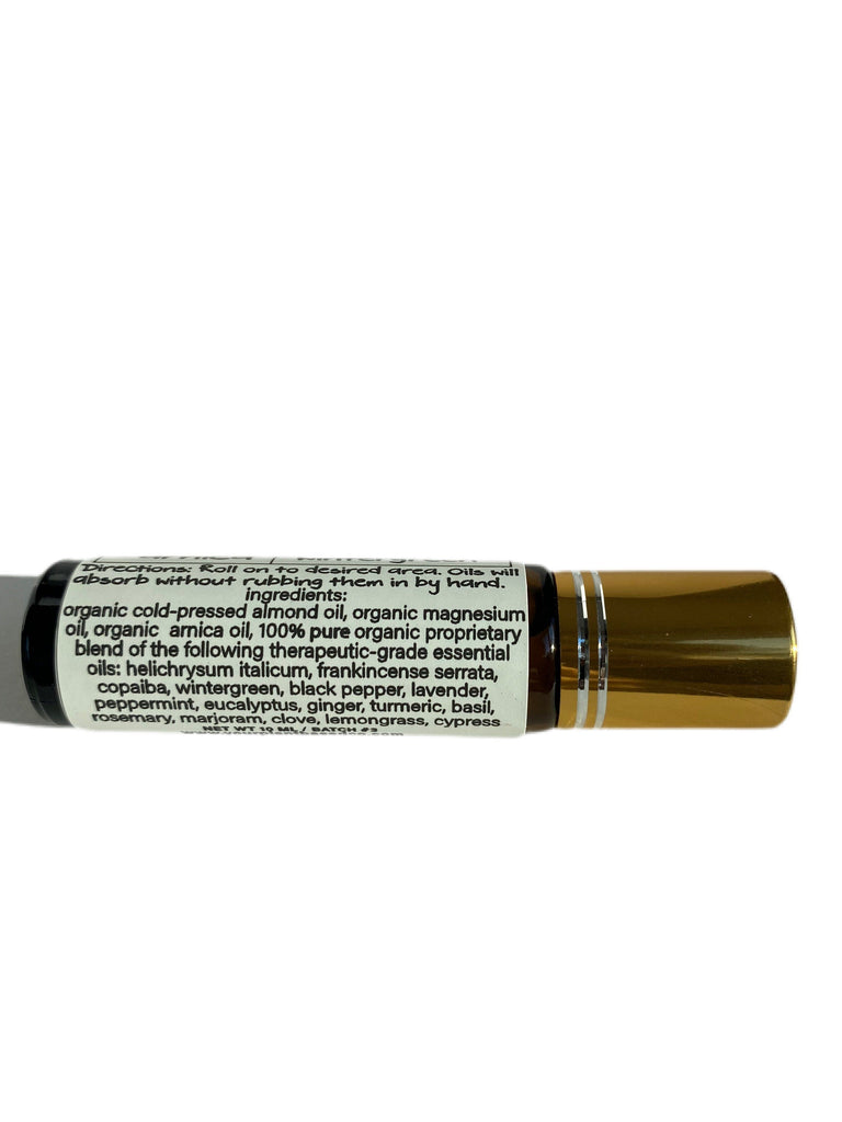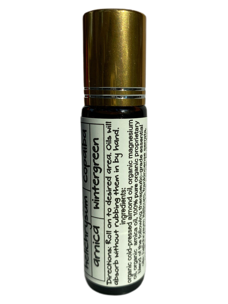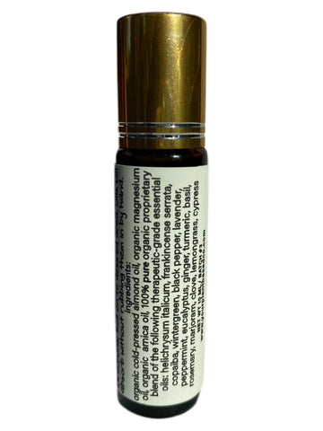 Ingredients: Organic Cold-Pressed Almond Oil, Organic Cold-Pressed Magnesium Oil, Organic Cold-Pressed Arnica Oil, Pure Therapeutic-Grade Helichrysum Essential Oil, Pure Therapeutic-Grade Frankincense Serrata Essential Oil, Pure Therapeutic-Grade Copaiba Essential Oil, Pure Therapeutic-Grade Wintergreen Essential Oil, Pure Therapeutic-Grade Black Pepper Essential Oil, Pure Therapeutic-Grade Lavender Essential Oil, Pure Therapeutic-Grade Peppermint Essential Oil, Pure Therapeutic-Grade Eucalyptus Essential Oil, Pure Therapeutic-Grade Ginger Essential Oil, Pure Therapeutic-Grade Turmeric Essential Oil, Pure Therapeutic-Grade Basil Essential Oil, Pure Therapeutic-Grade Rosemary Essential Oil, Pure Therapeutic-Grade Marjoram Essential Oil, Pure Therapeutic-Grade Clove Essential Oil, Pure Therapeutic-Grade Lemongrass Essential Oil, Pure Therapeutic-Grade Cypress Essential Oil