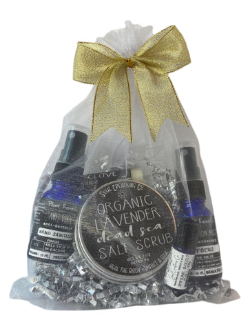 STRESS DEFENSE Kit Contains: 1 Small Hand Sanitizer, 1 Mini Immune Boost Roll-On, 1 Travel Dead Sea Salt Scrub or Coconut Sugar Scrub, 1 Organic Chapstick, & 1 Mini Intention Mist Aromatherapy